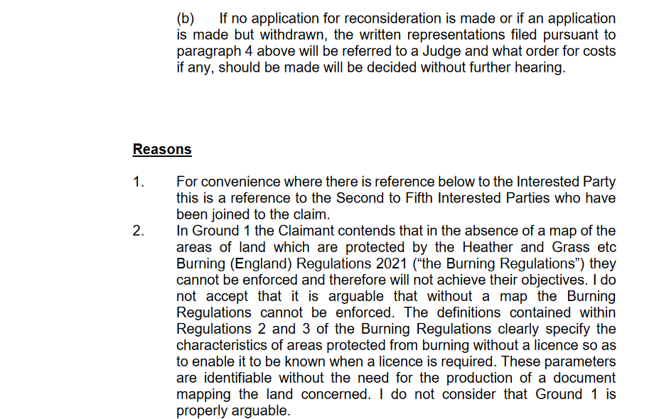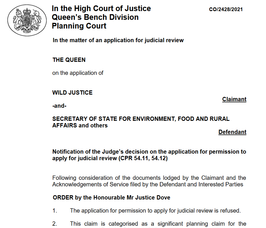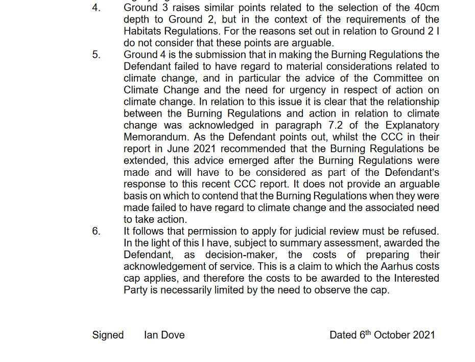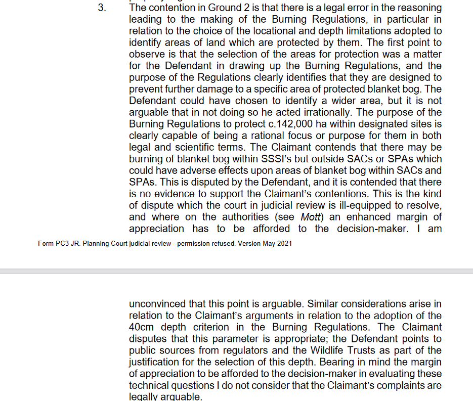 Wild Justice believes that the DEFRA measures are inadequate; they do not protect all peatland areas, only those with peat above a certain depth and which are notified as SSSIs and designated as SPAs and/or SACs. It is accepted by all that this protection amounts to less than half of the area of upland peat that could have been protected with better, tighter, more appropriate, wording. The Hon Justice Dove has decided that we cannot go to court to argue these points and states that DEFRA has considerable latitude in framing such regulations. We wonder how little DEFRA could do and get away with it. We shall consider an appeal.