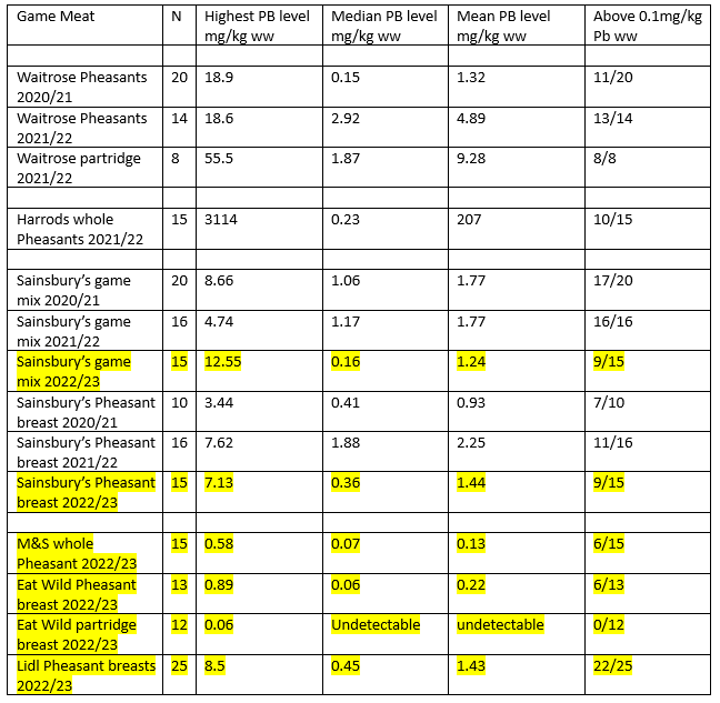 Is there evidence here of lower lead levels in game meat on sale to the public? Yes, although it is too soon to whoop with joy and there is a long way to go. But all credit to Holme Farmed Venison whose Eat Wild partridge breasts were the first samples we have seen of game meat where all of the samples had below the legal level of lead for non-game meat. That’s good and came as a pleasant surprise. As a very rough and ready measure, if one compares the proportion of samples above 0.1mg/kg Pb ww this year, 52/95 (55%), with those from the previous two years, 93/119 (78%) it looks as though things might be getting better (and it would look that way even more if we hadn’t discovered those very high levels in Lidl stores in Northern Ireland and the Republic of Ireland).