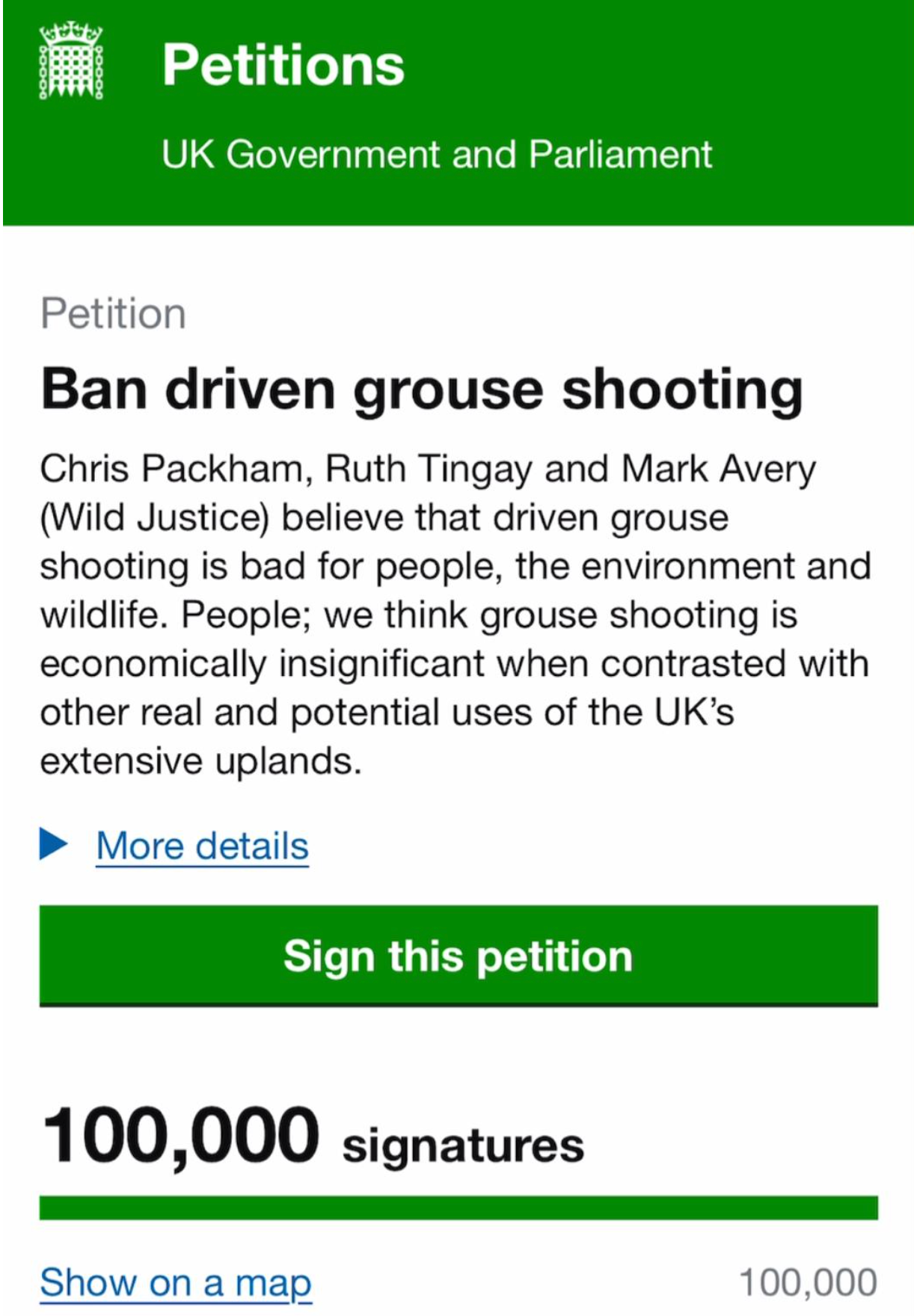 Ban driven grouse shooting petition – 85,000 signatures 7th April 2025 Our Ban Driven Grouse Shooting petition has passed the milestone of 85,000 signatures and is now standing at over 88,000… Read more >