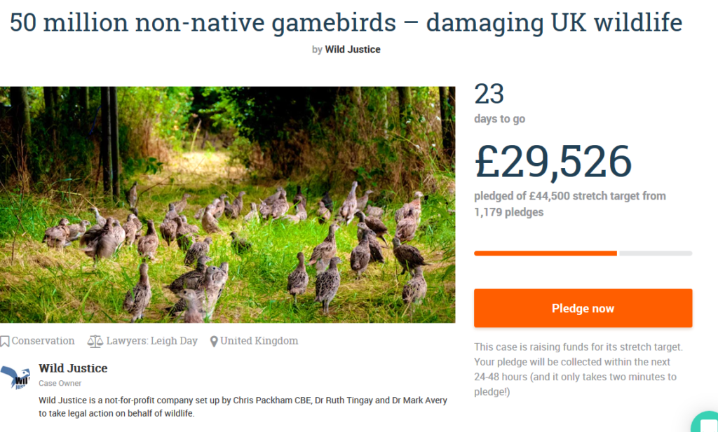 The Wild Justice crowdfunder to raise funding for a legal challenge of Defra (until yesterday actually of Michael Gove but now of Theresa Villiers) will complete its first week at 10am this morning. We are aiming to force Defra to carry out an ecological assessment under the Habitats Directive of the impacts of releasing 50 million non-native gamebirds, Pheasants and Red-legged Partridges, into the countryside every year.