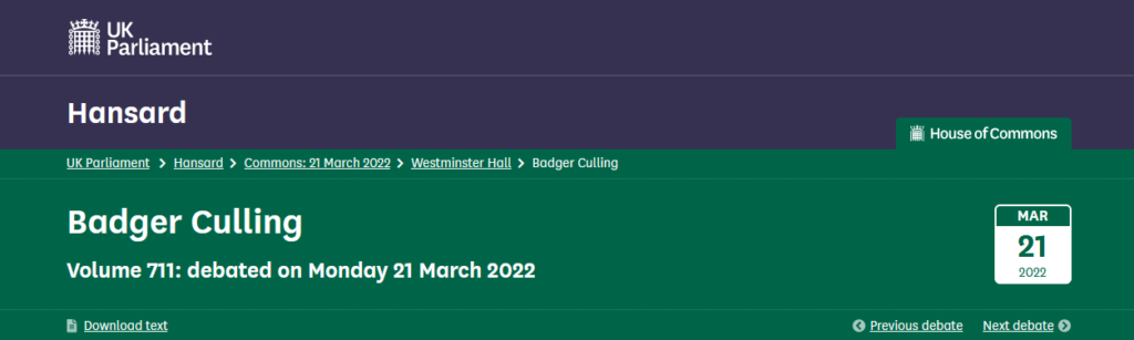 Daniel Zeichner (Labour, Cambridge): spoke for the Opposition EFRA team. He was well-briefed and on top of the subject to a large degree. Labour’s position would, in theory, avoid these welfare issues by switching to Badger vaccination, biosecurity and movement controls. Mr Zeichner made these points of direct relevance to the petition ‘The petition has a significant number of signatures. It focuses on the killing of badgers rather than the bovine TB issue, which I shall return to. The view expressed is that the shooting of badgers is poorly monitored and inhumane. Anecdotally, one is certainly told of cases where badgers are not shot cleanly and are left with injuries. According to Natural England’s compliance monitoring report for 2020, badgers were shot at but not retrieved in 11.4% of cases, but only one case of a badger being shot at but wounded and lost was reported; presumably some of the rest may not have been found. As with all such figures, the situation is not clear. I suggest that there is some cause for concern.‘ and ‘Can the Minister say why the number of badgers culled through free shooting rather than cage-trapping has changed so dramatically? According to the figures in the very good briefing prepared by the House of Commons Library, those numbers have increased from rough parity in 2014 to around four in five in 2020, creating a greater risk of inhumane culling. What is the reason for that? It seems that that is directly relevant to the question raised by the petitioners.‘. Mr Zeichner had read the exam question and scored high marks from us as a result.