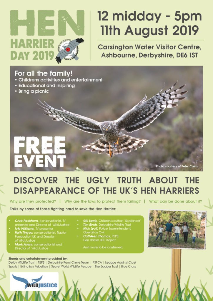 Speakers: will include children’s author Gill Lewis, Wild Justice director Ruth Tingay, RSPB Hen Harrier Life Project’s Cathleen Thomas, Wales raptor enthusiast Dan Rouse, Hen Harrier Westminster Parliament species champion Angela Smith MP (tbc) and Green Party former leader Natalie Bennett [and a similar number of men].