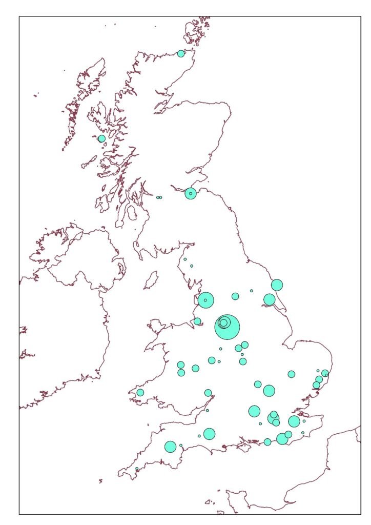 Figure 1. Distribution of subjects taking Test 2. The size of the circles is proportional to each subject’s Test 2 glyphosate levels.