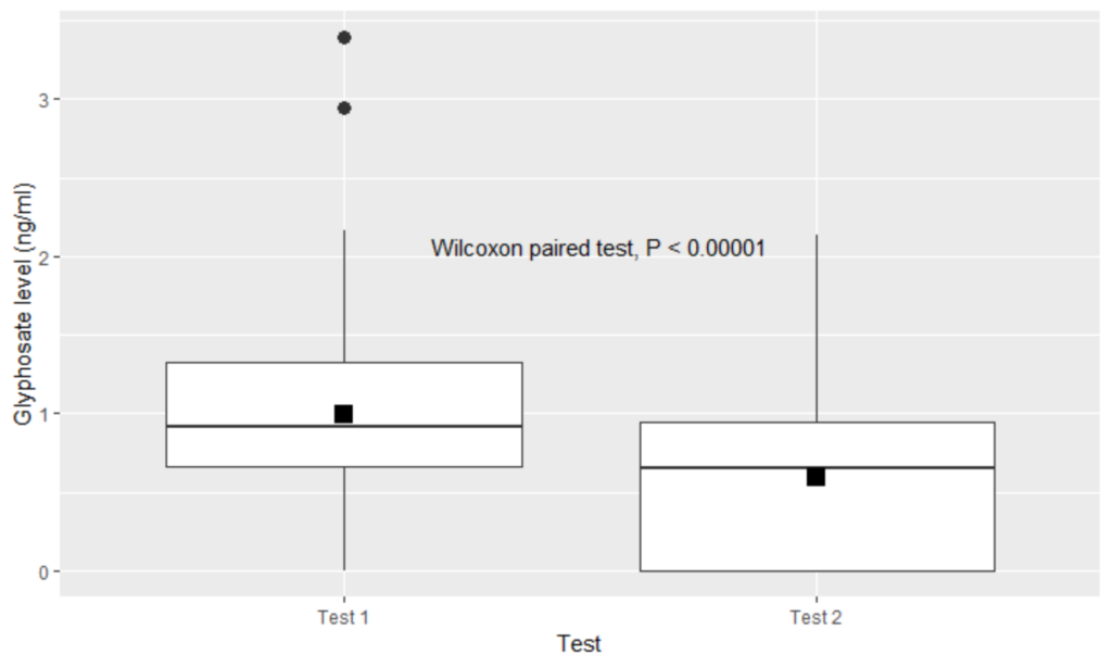 However, urine glyphosate levels were lower, slightly but significantly, in the autumn tests compared with the spring tests.