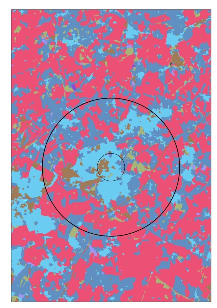 Figure 3. An example of 1- and 5-km buffers around a postcode centre (in this case LE10 1HJ) placed over the UKCEH 25-metre land-cover product. Red indicates arable land, dark blue is agricultural grassland, light blue is suburban land, olive-green is urban land and light green is woodland.