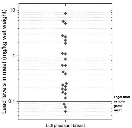 Our findings on the high lead content of pheasant breasts sold in Lidl stores don’t come as any surprise as they align with the results of previous tests we’ve undertaken on gamebird meat sold in Sainsbury’s, Waitrose, Harrods, and by three independent game dealers, over the last two years (e.g. here, here, here, here, here, here). Our results also align with the results of a recently published peer-reviewed study conducted by scientists at the University of Cambridge (here).