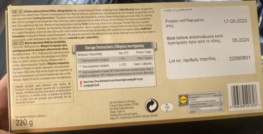What’s also odd is the stated date the Pheasant breasts were frozen (17th May 2022 according to the Lidl packaging shown in the photo above). Given the Pheasant-shooting season closes on 31st January (in Northern Ireland) and 1st February (rest of the UK), and assuming these Lidl Pheasants were all shot on the last day of the season, where and how were these shot Pheasant carcasses stored for at least 3.5 months if they weren’t frozen prior to export? Or were they frozen prior to export, defrosted in Poland, and then refrozen for transfer to NI and the RoI?