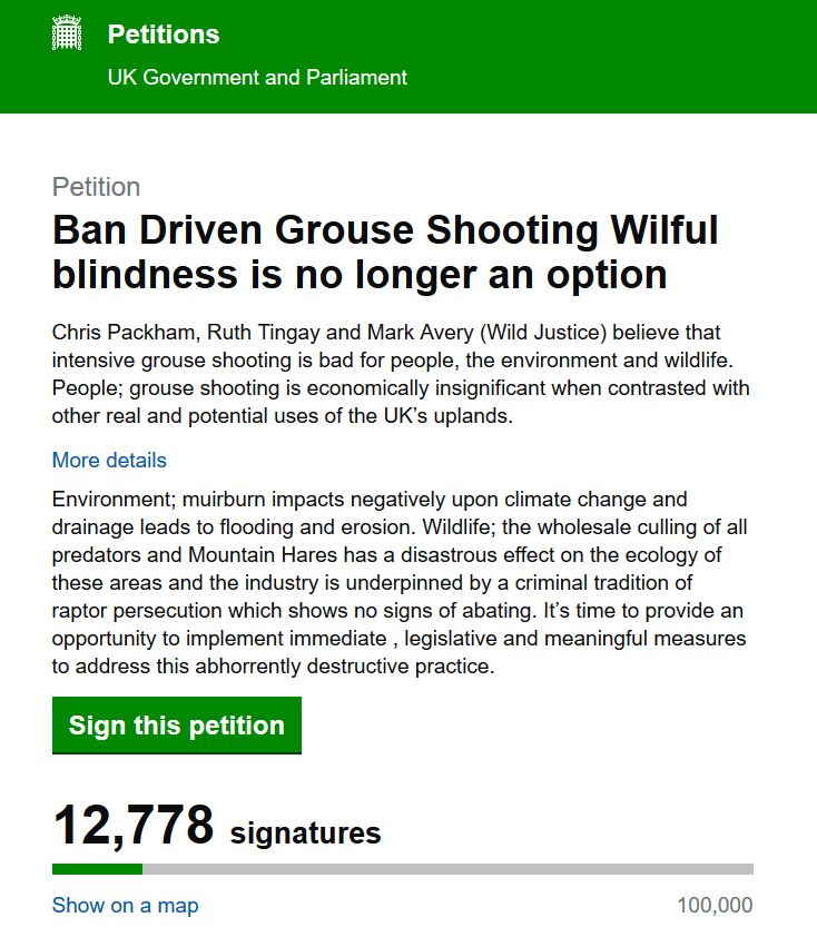 The three directors of Wild Justice have a 5-year track record of calling for a ban of intensive Red Grouse shooting. Yesterday, late afternoon, this latest UK-wide e-petition calling for a ban on driven grouse shooting appeared, and by bed time it had already passed the 10,000 signatures which will trigger a response from the Westminster government (they’ll say ‘no’).