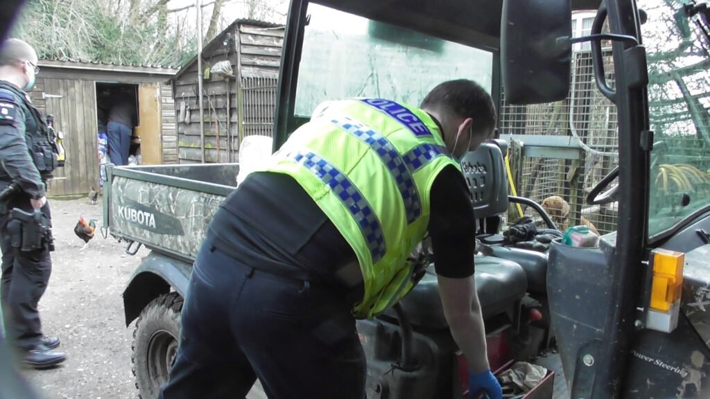 Nearby, under an old pond liner, were two tins of the fumigant pesticide Cymag. This gives off the very toxic hydrogen cyanide gas when brought into contact with moisture and storage like this is dangerous as well as illegal. Cymag was legally used to gas rats and rabbits until the end of 2004, though it also has a bad reputation for use in the illegal gassing of badgers and foxes. This particular brand was probably banned in the 1990s. In the rear yard were a number of insecure outbuildings and his 4×4 Mule vehicle. In a toolbox in the vehicle were three small pots containing a powder – later confirmed as Bendiocarb. The footwells of this vehicle were also swept by the CSI and traces of Bendiocarb were also detected in the dirt.