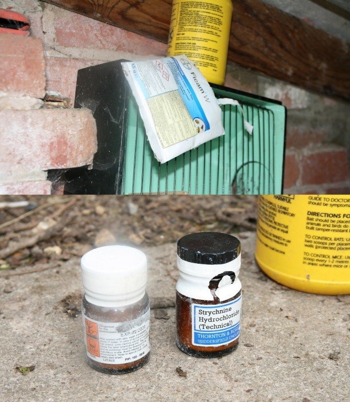In an outbuilding was a part-used sachet of Ficam W (Bendiocarb), a product which had been banned three months earlier. Next to this was an old rodenticide container, and inside this were hidden two small bottles of Strychnine, another product banned since August 2006. In previous cases suspects have claimed no knowledge of any pesticides and stated they must had been languishing in outbuildings for many years before they arrived. I know of one case where this was probably true. A helpful clue in this case was an ‘01’ phone number on the old rodenticide container, this reflected the national ‘PhONEday’ number changes in 1995, which was after the gamekeeper had first taken up residence at the address. BT Archives kindly provided a statement to cover this point.