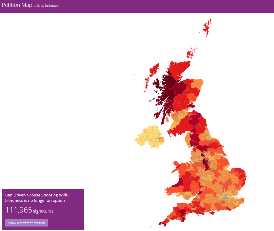 The Wild Justice petition, signed by many readers of this blog and many, many others across the UK, including in grouse shooting areas (see map below) had a debate in Westminster Hall yesterday. Labour MPs were woefully thin on the ground and LibDems totally absent. The SNP spoke and made some good points about how they do things differently in Scotland and the Labour Shadow Minister, Olivia Blake, was good. Here is a link to the transcript – isn’t it amazing how quickly these appear?