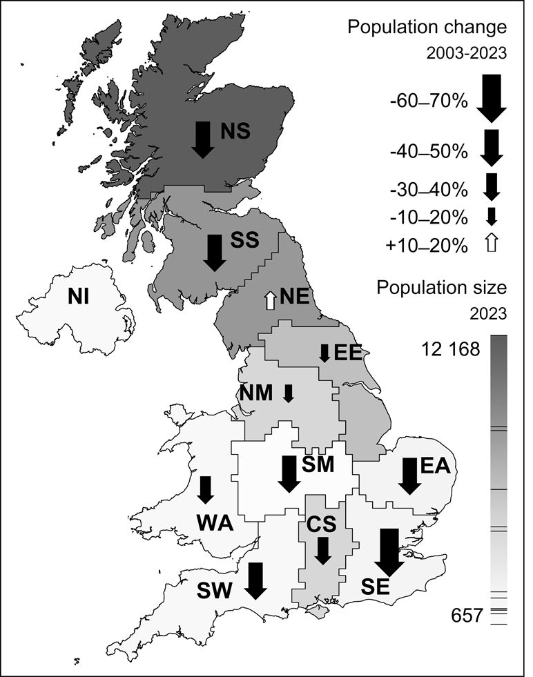 There were increases in some regions since the last national survey in 2013, but also some big falls in other areas. Overall the British population has declined further in the last decade and has declined by 35% since 2003. Here is a map showing the declines:
